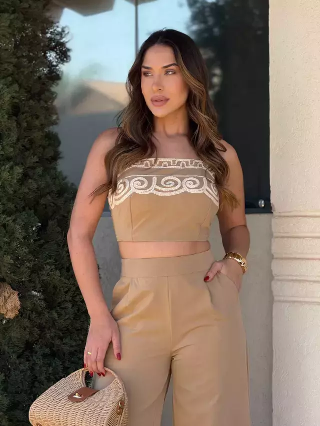 Este conjunto é confeccionado em tecido leve e confortável, garantindo caimento impecável e elegância. O cropped possui alças reguláveis, bojo embutido e lastex nas costas, oferecendo ajuste perfeito e sustentação. Já a calça pantalona apresenta bordados delicados na barra, modelagem ampla para liberdade de movimento e bolsos funcionais com zíper invisível lateral para maior praticidade.