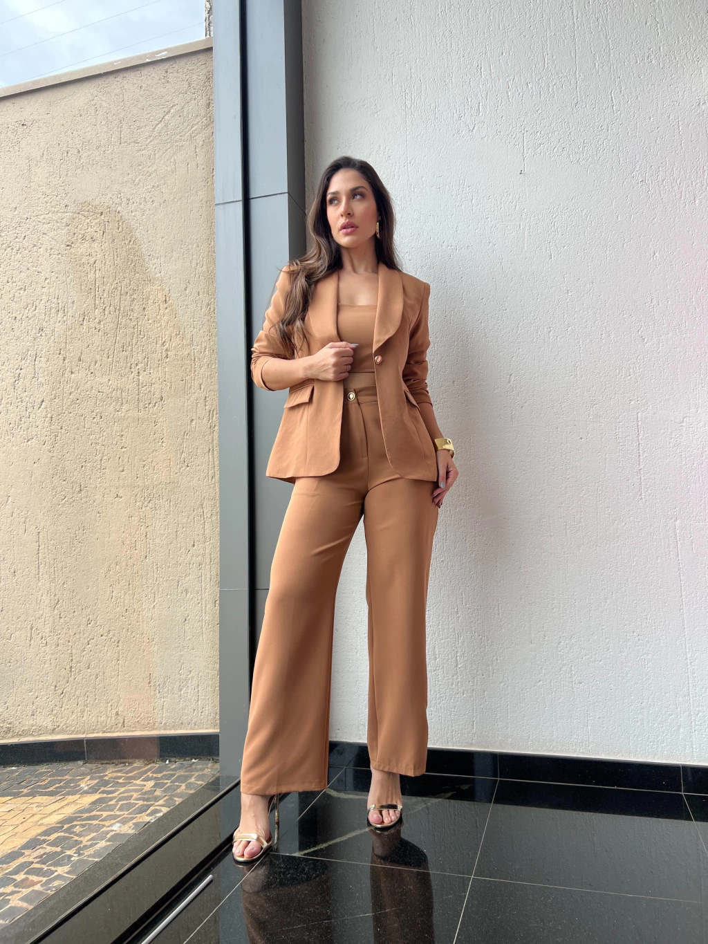 Este conjunto de três peças traz elegância moderna e versatilidade em cada detalhe. O blazer possui estrutura leve e acabamento sofisticado, perfeito para valorizar qualquer produção. A calça pantalona, com bolsos funcionais, oferece caimento fluido e alonga a silhueta com conforto. O top cropped tomara que caia conta com lastex nas costas, garantindo ajuste impecável ao corpo.